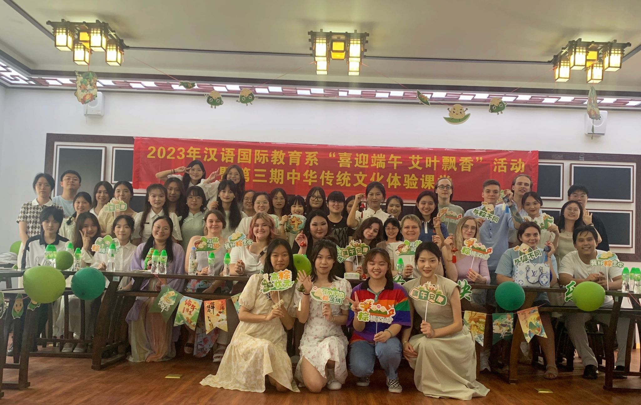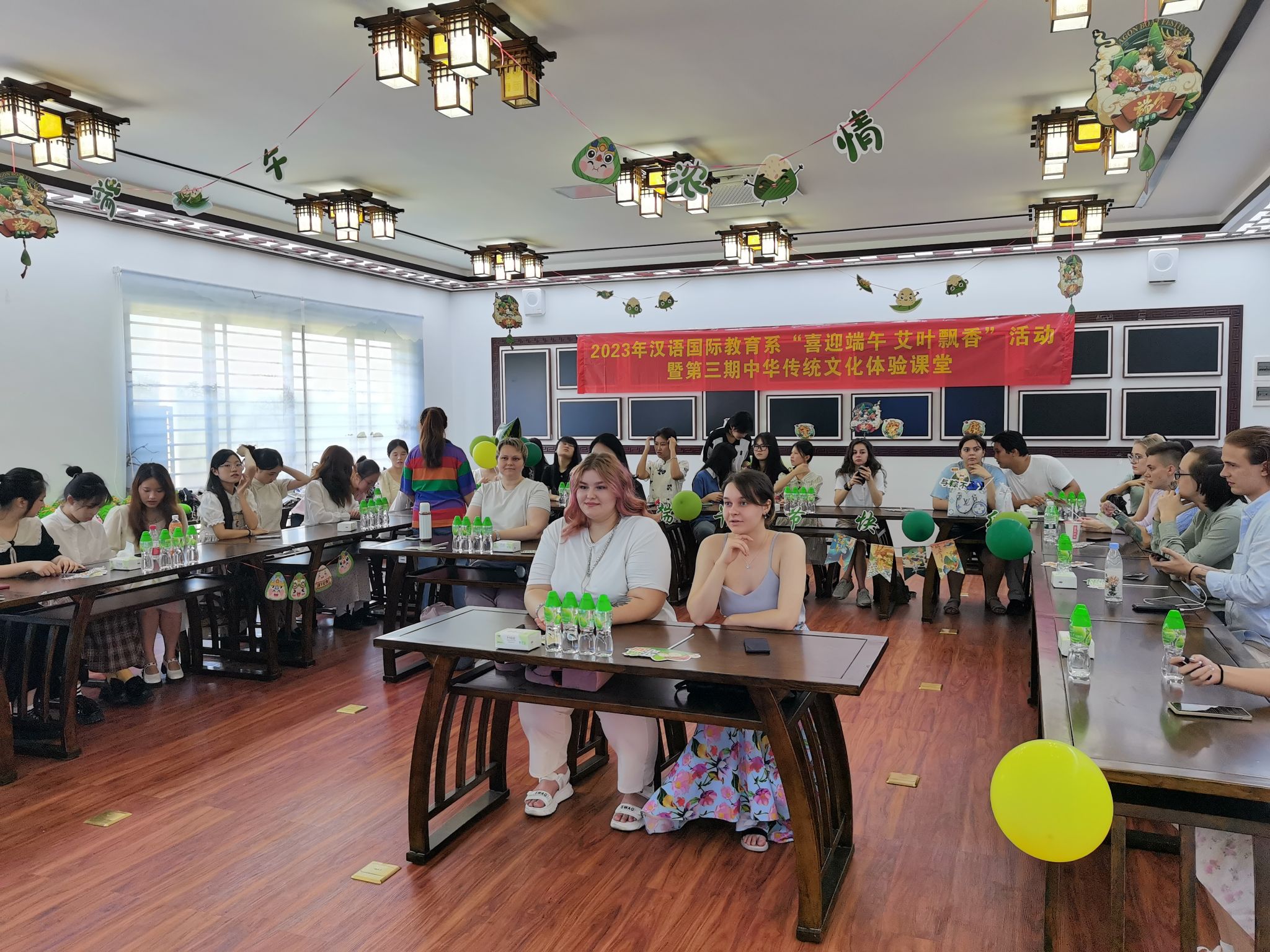 汉语国际教育系于2023年6月19日上午在传统文化实训室举办了“喜迎端午,艾叶飘香”中华传统文化体验活动,近50余名师生共同参与。此次活动旨在为汉语国际教育专业学生提供实践教学平台,同时也让留学生感受中国传统节日的氛围、感受中华传统文化的魅力。