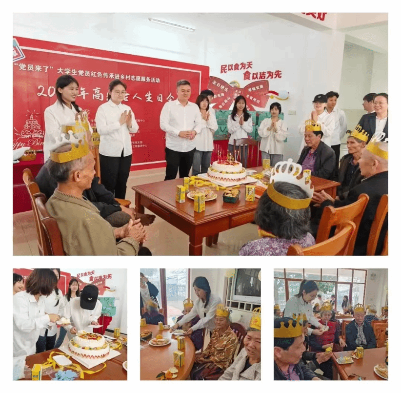 为大力弘扬志愿精神,深入开展学生党员志愿活动,切实增强我院学生党员的志愿服务意识、社会责任意识和甘于奉献精神,展现关怀老人、服务和谐社会的精神风貌,2024年3月12日,我校122cc太阳成集团学生党支部与演丰镇塔市村志愿者服务队伍,在塔市村日间照料中心联合开展了“‘党员来了’大学生党员红色传承进乡村志愿服务活动——高龄老人生日会”助老爱心活动。