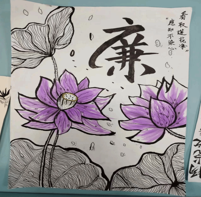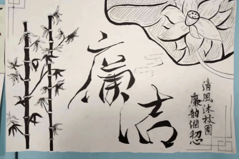 古有周敦颐“莲出淤泥而不染,濯清涟而不妖,中通外直,不蔓不枝,香远益清,亭亭净植”,今有同学们画莲喻清廉,刻竹喻正直,现青天喻公正等。一幅幅手抄报都含有着清廉、正直的意蕴,同学们将自己心目中代表清廉的事物形象通过手抄报的形式展现了出来。