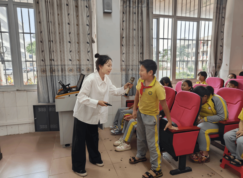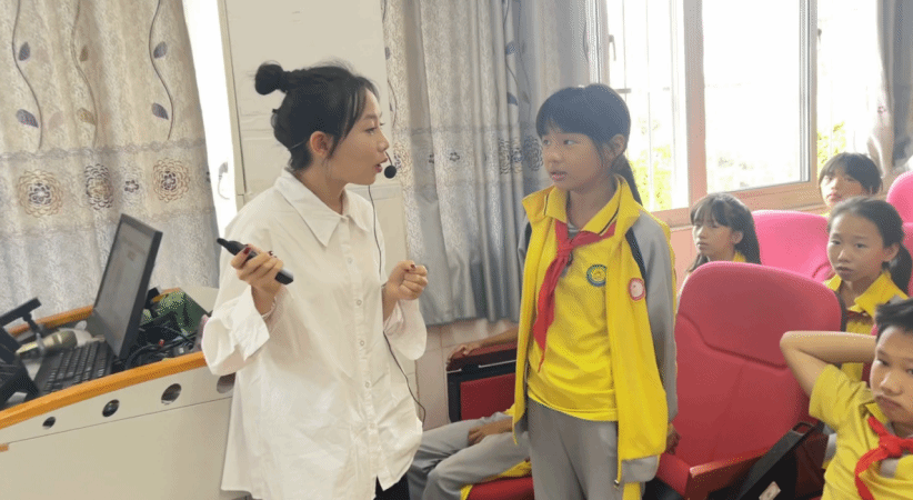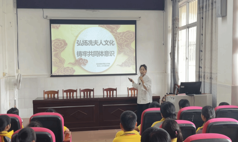 宣讲团成员方盈同学从冼夫人的生平、事迹、贡献和启发四个部分进行宣讲,通过讲故事、观看视频、小组讨论等方式让同学们在冼夫人可歌可泣的故事与传说中,感受冼夫人以民为本、维护国家统一、民族团结的家国情怀。宣讲到最后,同学们共同齐读“好心三字经”,通过诵读的方式进一步理解洗夫人文化的核心“好心精神”,“好心精神”是中华优秀传统文化的结晶,与社会主义核心价值观有跨越古今的契合关系,宣讲团通过讲述巾帼英雄故事引导小学生从中汲取力量,做民族团结的践行者,国家统一的维护者,社会进步的推动者。