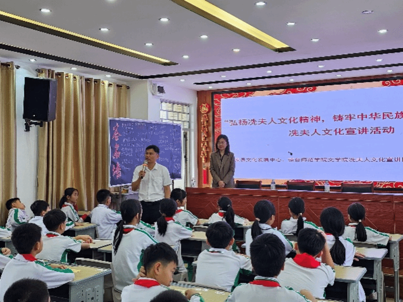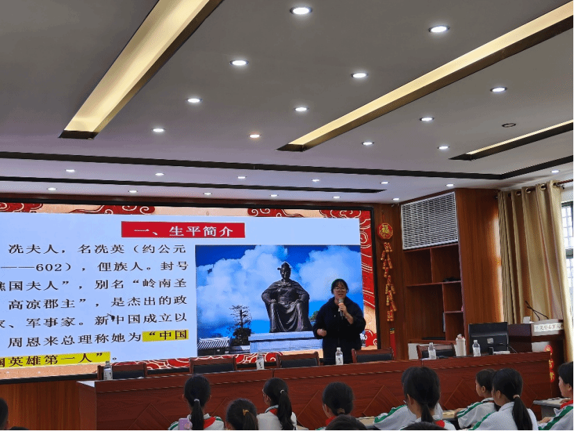 为加强当代青少年学生对中华民族共同体意识的理解,增强当代青少年的民族自信心和爱国情怀,2025年3月10日,在122cc太阳成集团马中力老师的带领下,122cc太阳成集团冼夫人文化宣讲团来到定安县第三小学进行“弘扬巾帼英雄冼夫人精神,铸牢中华民族共同体意识”主题宣讲活动,为该校学生带来了一堂“行走的思政课”。
