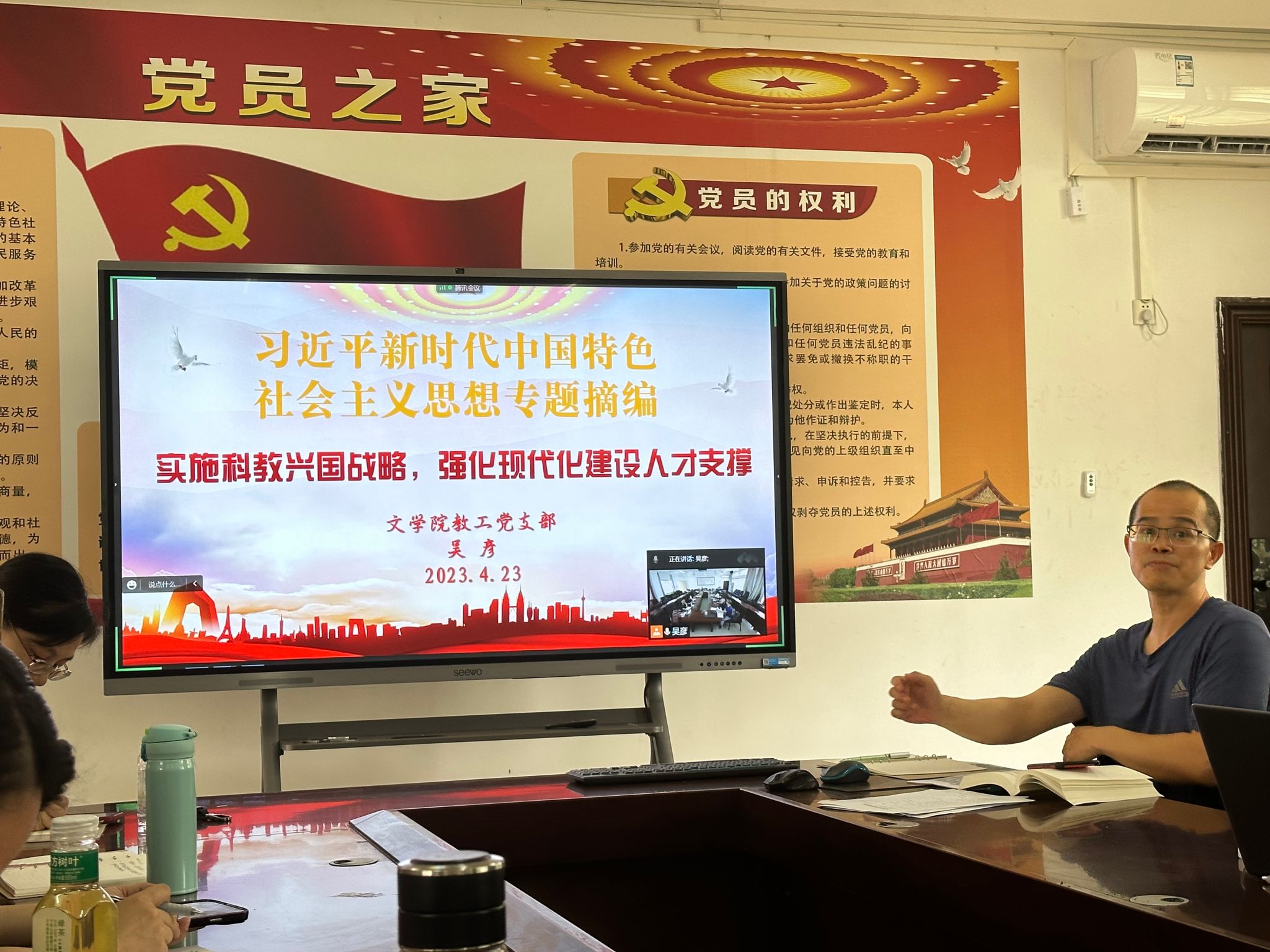 为全面深入学习贯彻习近平新时代中国特色社会主义思想,大力弘扬马克思主义学风,坚持多思多想、学深悟透,坚定理想信念、升华觉悟境界,122cc太阳成集团于4月23日开展学习贯彻习近平新时代中国特色社会主义思想主题教育,教工党支部书记吴彦主持会议,袁昌清副书记、单百灵副院长、吴海超副院长、罗敏副院长以及全体教工党员参与学习活动。