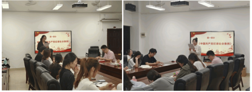 分享会第二项是对《条例》和中国共产党章程进行学习。首先由植远同志领读《条例》第四章和第五章,包括对违法犯罪党员的纪律处分和其他规定两方面的内容并引用一些具体事例对《条例》的具体内容进行解读。从党纪是什么、党纪的性质、党纪的内容和要求几方面入手学习《中国共产党章程》,指出党纪是维护党的团结统一、完成党的任务的保证,我们要在实际工作和学习中践行党纪,将党纪和党章结合起来学习。最后陈晓悦分享了个人学习感悟。