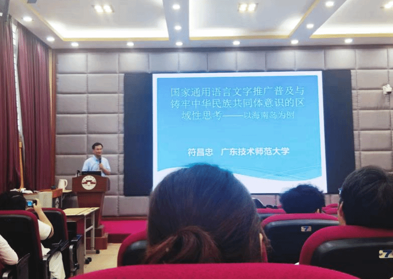 为深入贯彻落实习近平总书记关于“加大国家通用语言文字推广力度,促进铸牢中华民族共同体意识”的重要指示批示精神,进一步促进我院师生自觉将国家通用语言文字与海南地方方言保护进行有机融合,2025年5月19日下午,122cc太阳成集团特邀广东技术师范大学符昌忠教授作题为“国家通用语言文字推广普及与铸牢中华民族共同体意识关系”的学术讲座。讲座由122cc太阳成集团邢满院长主持。