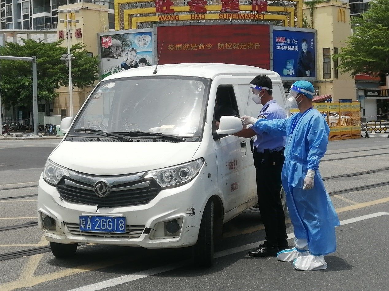 上级领导考虑到面粉厂小区的工作强度,本着保障志愿者健康和安全的宗旨,从8月14日开始,将吴彦以及其他两位同志调整了工作区域,安排他们到三亚解放路与金鸡岭路交岔路口执勤,协助民警工作,严查往来车辆和人员。在新的工作岗位上,吴彦同志一如既往全心投入,烈日炎炎之下,尽显共产党员的先锋模范作用,坚决践行 “疫情不退我不退”的铿锵誓言,让党旗在防控疫情斗争第一线高高飘扬。