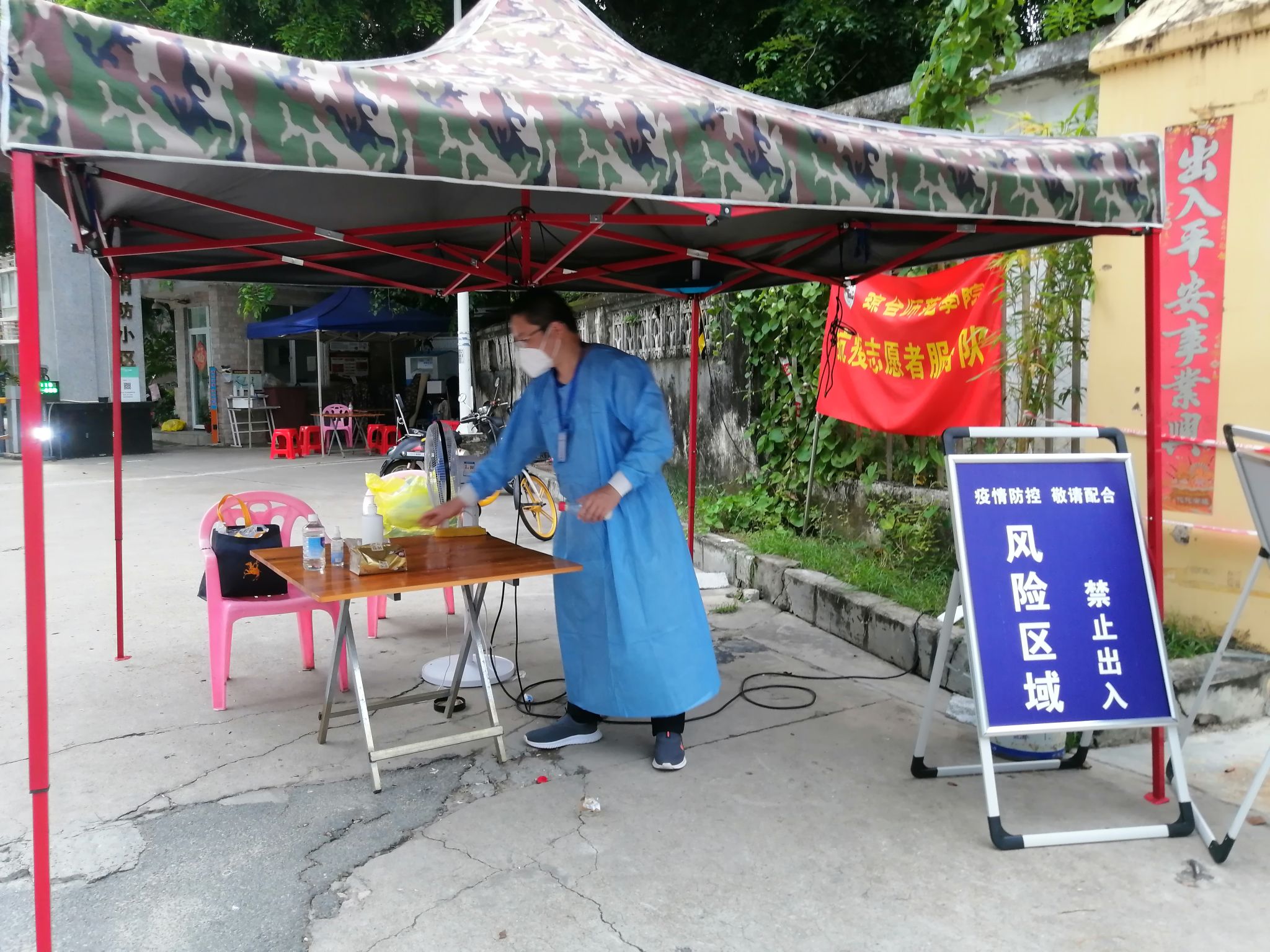 值班点仅有的配套设施是一座临时搭建的遮阳篷、一把椅子、两张桌子、一个风扇和一盏电灯。由于周围没有洗手间,所以在值班期间,杨老师不敢大量饮水,不断地克服生理上由于缺少饮水带来的不适感,在三亚这种艳阳天下,每当换班更衣的时候总能看见他湿透的衣服。尽管工作条件很简陋,工作强度也大,但杨彬老师没有丝毫抱怨,而是怀着必胜的信心抗击疫情,积极应对遇到的所有问题。