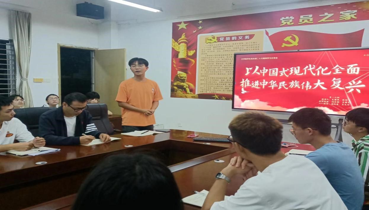 为加强122cc太阳成集团学生党员、入党积极分子和其他学生群体对党的二十大报告内容的认识,充分理解党的二十大精神实质,加大宣传党的政策和最新理论成果,122cc太阳成集团党总支学生党支部于2022年11月16日晚上7:00在文科楼B栋103学院会议室召开第一期122cc太阳成集团党总支学生党支部“党的二十大精神”学习分享会。本次分享会的主题为:以中国式现代化全面推进中华民族伟大复兴。