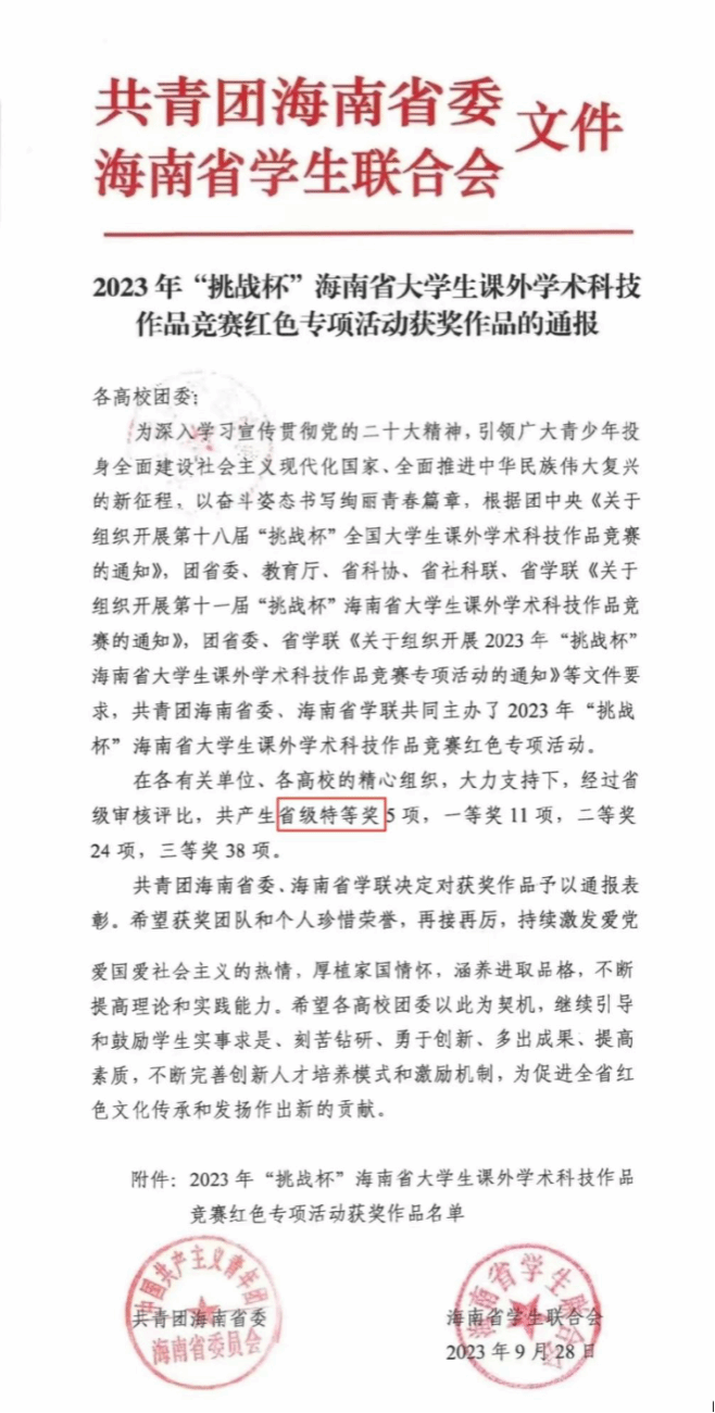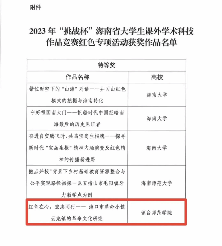 近日,2023年“挑战杯”海南省大学生课外学术科技作品竞赛红色专项活动获奖名单公布,经校级选拔推荐和省级审核评比,我院网络与新媒体专业学生应雪茹、郑在康的作品《红色在心,宏志同行——海口市革命小镇云龙镇的革命文化研究》获得省级特等奖。