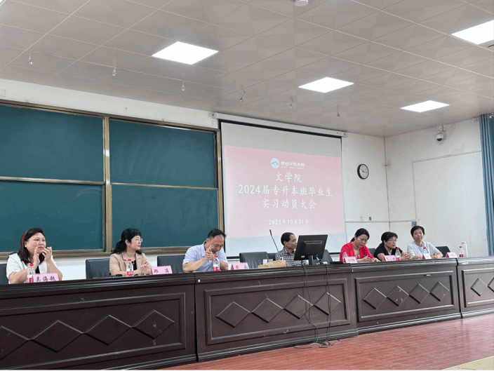 2023年10月31日上午,122cc太阳成集团2024届专升本毕业生实习动员大会在文C202召开。出席本次大会的有邢满院长、符永书记、吴海超副院长、4位实习带队老师、3位毕业班班主任、2位毕业班辅导员及124位专升本班毕业生。会议由2024届毕业生吴龙飞同学主持。