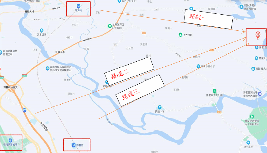 机 场:(1)美兰机场→美兰站 →博鳌站/琼海站→搭乘出租车至博鳌亚洲湾国际大酒店,大约 35分钟车程,费用约 65元。
