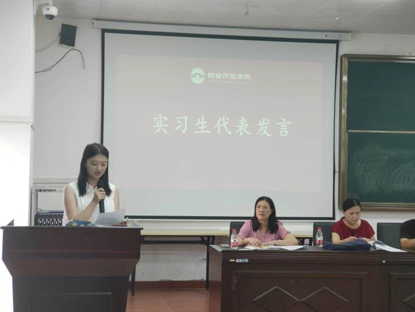 会议第四项,由2020汉语言文学2班周金金同学代表全体实习生发言。她表示全体实习生将努力做有仁爱之心、有理想信念、有道德情操、有扎实学识的四有好老师,积极主动地锻炼自己,充分发挥积极性主动性,应用好平时所学的知识,用先进的方法与理念教育学生。实习生们会好好把握此次实习机会,虚心地向优秀的前辈们学习,在实际工作中不忘教师初心,积极争创出色成绩。