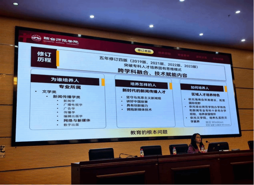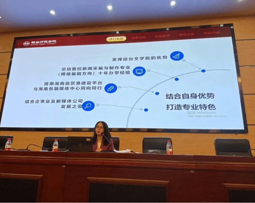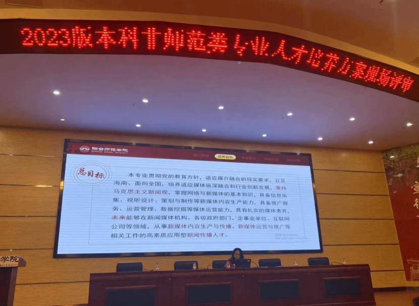 汇报陈述环节。曾艳宏老师2023版人才培养方案的修订历程、人才培养总目标、毕业要求内容、毕业要求指标点以及课程矩阵设置等内容进行了详细汇报。汇报过程中曾艳宏老师强调,随着信息技术的飞速发展,网络与新媒体行业对应用型人才的需求日益迫切,因此,专业人才培养适应行业发展需求,培养具有较强实践能力和创新精神高素质人才。此外,曾艳宏老师还结合海南自贸港建设背景和122cc太阳成集团办学条件优势,陈述了网络与新媒体专业的办学特色。